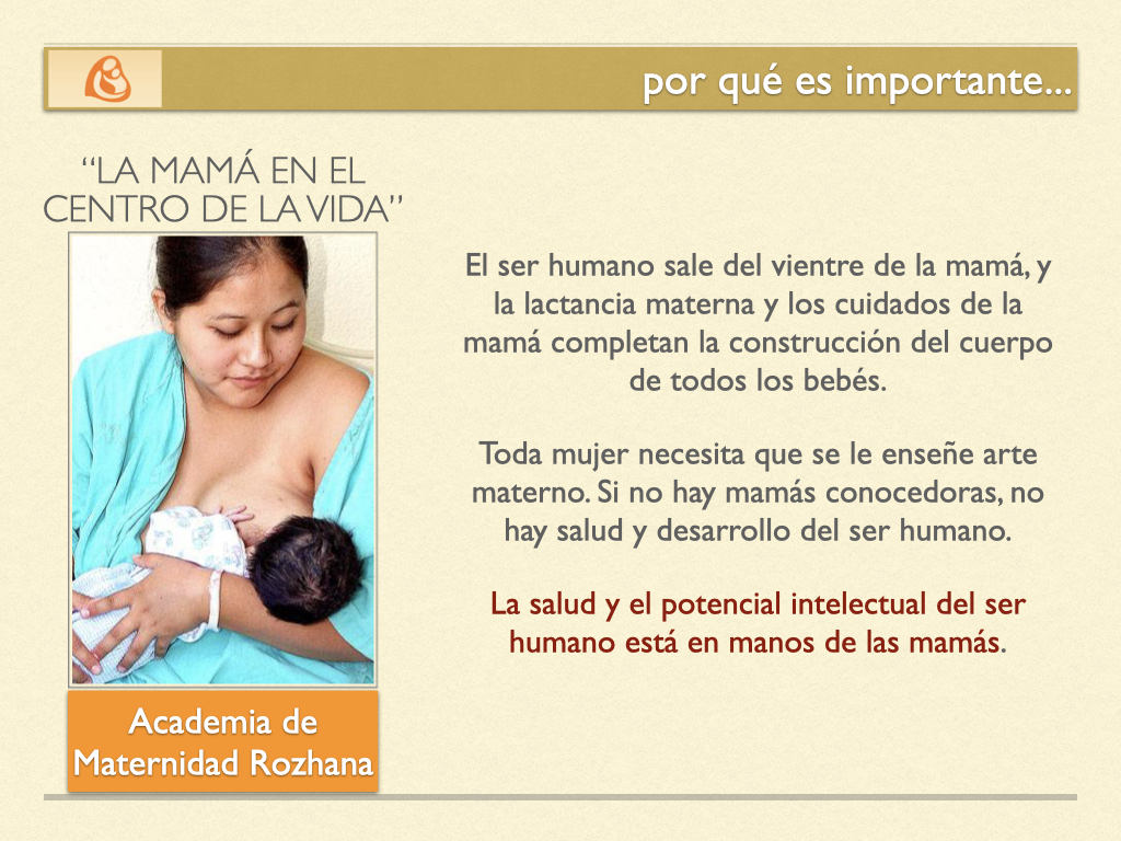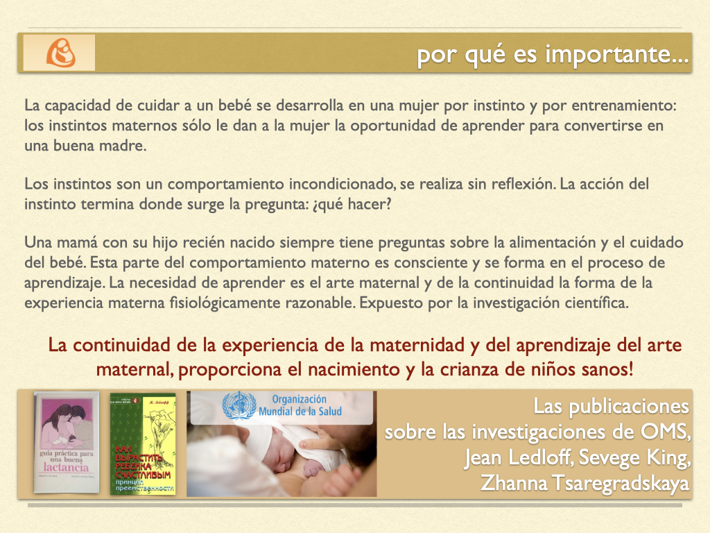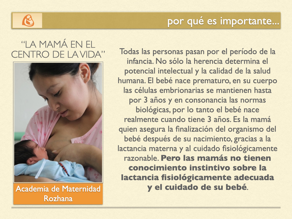 Entre los principios fundamentales del proyecto se destacan la importancia de que la maternidad esté respaldada por el conocimiento, no solo por instinto; la idea de que cuanto más se ajuste la maternidad a la naturaleza, mejor será la salud física y emocional de madre e hijo; y el hecho de que el desarrollo completo del bebé continúa hasta los tres años de edad, siendo la madre quien lo completa con lactancia materna y cuidados fisiológicos.