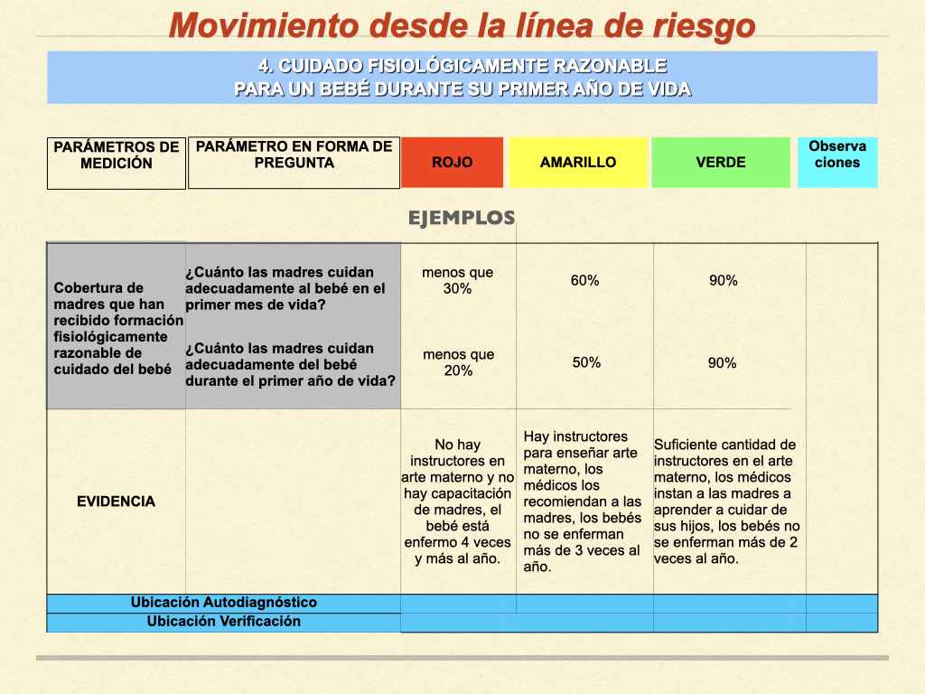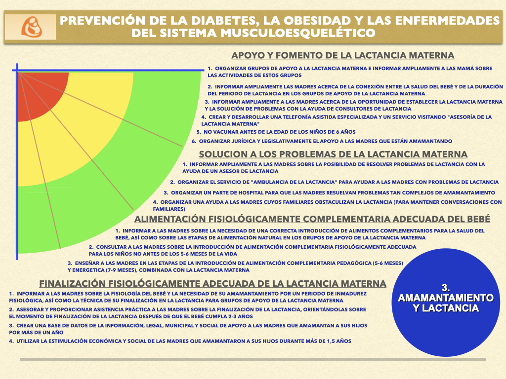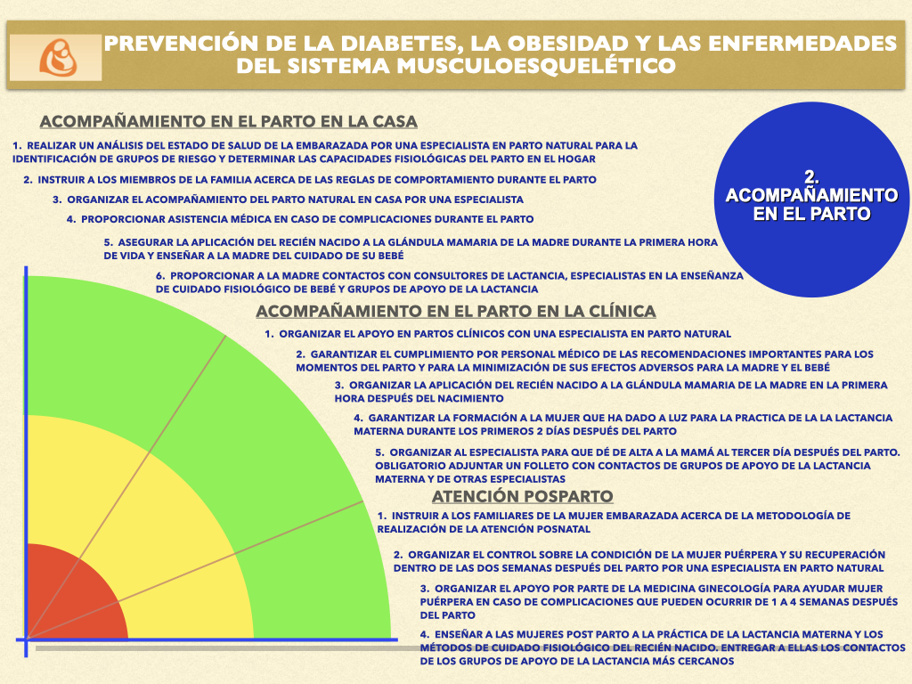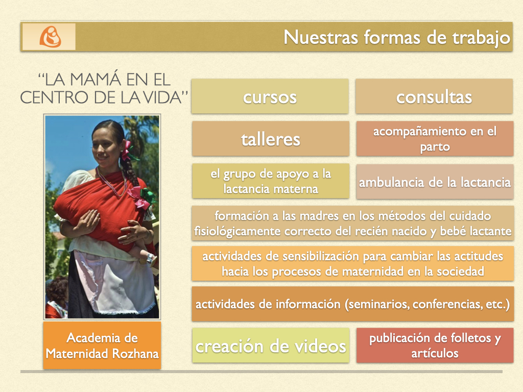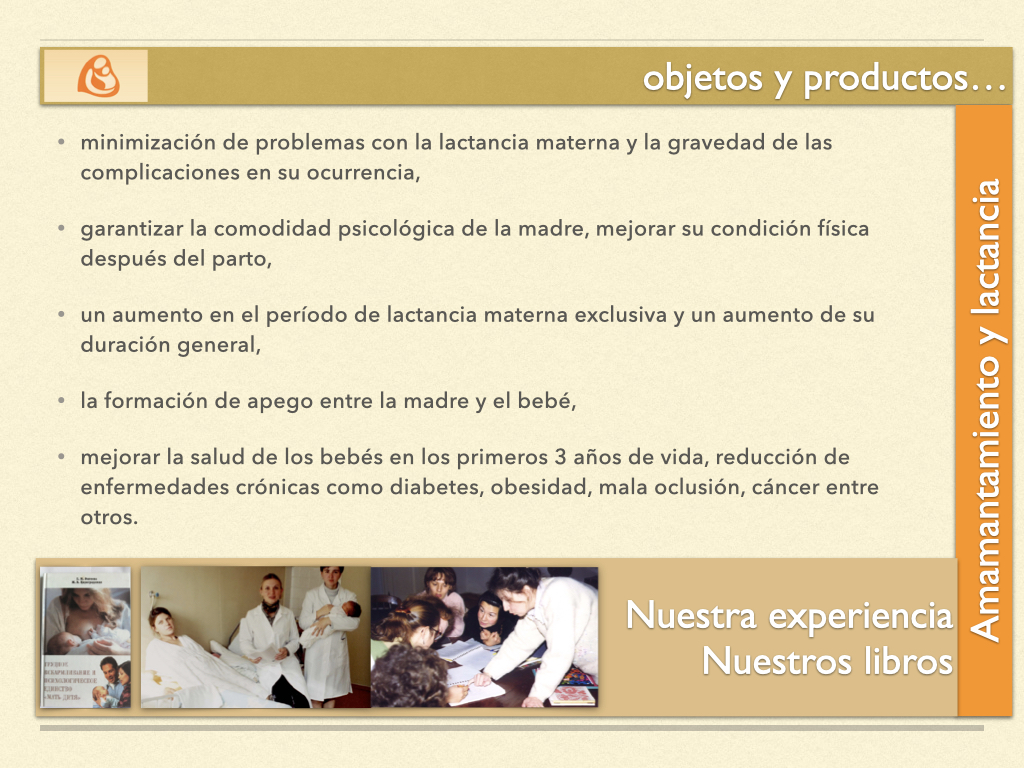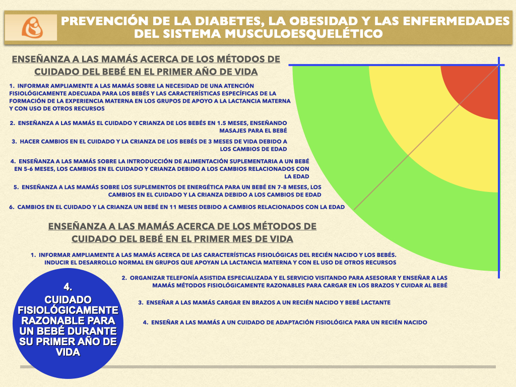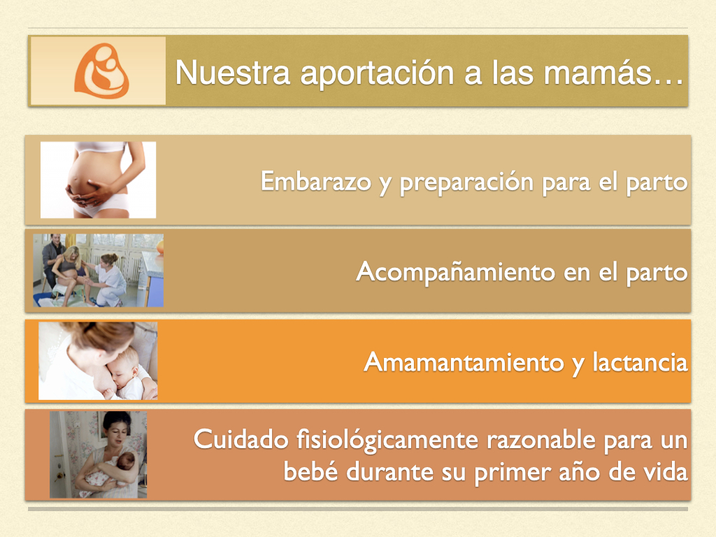 En cuanto a la lactancia materna y el amamantamiento, se proporciona apoyo y asesoría especializada para resolver cualquier problema, se organizan grupos de apoyo y una línea telefónica dedicada, se enseña la introducción fisiológica de alimentos complementarios y se promueve la finalización natural de la lactancia materna. Para el cuidado del bebé durante su primer año de vida, se imparten talleres prácticos mensuales adaptados al desarrollo del niño, se enseñan técnicas de porteo ergonómico, contacto piel con piel y estimulación temprana, todo ello enfocado en prevenir deformaciones físicas y trastornos neuropsíquicos.