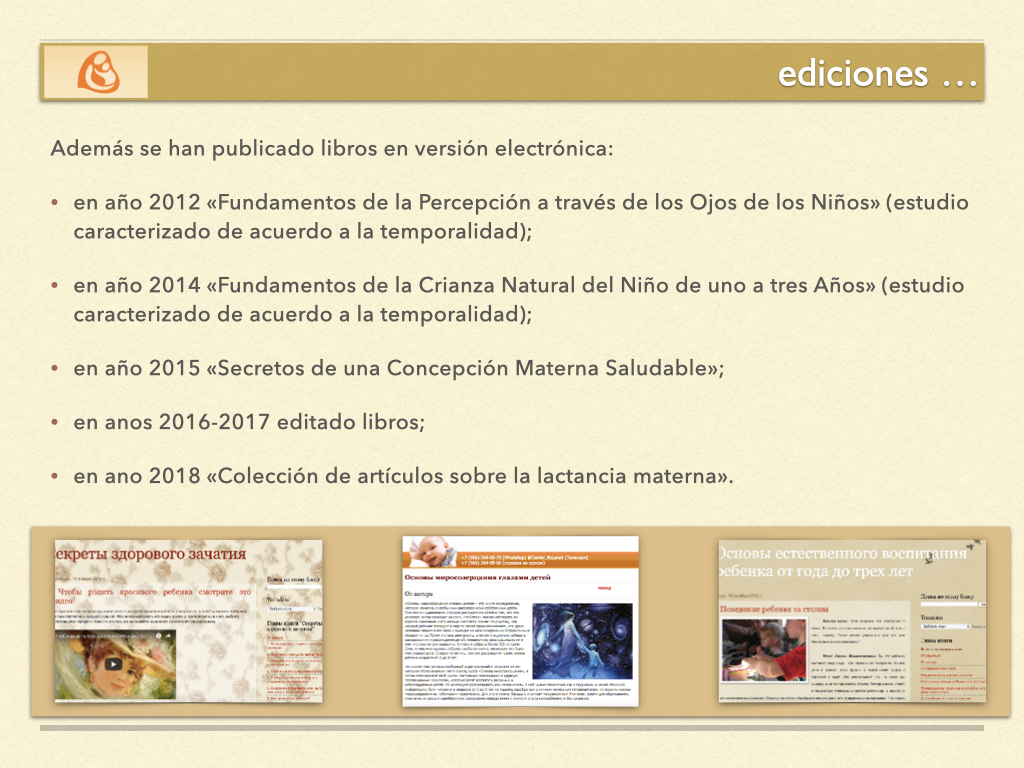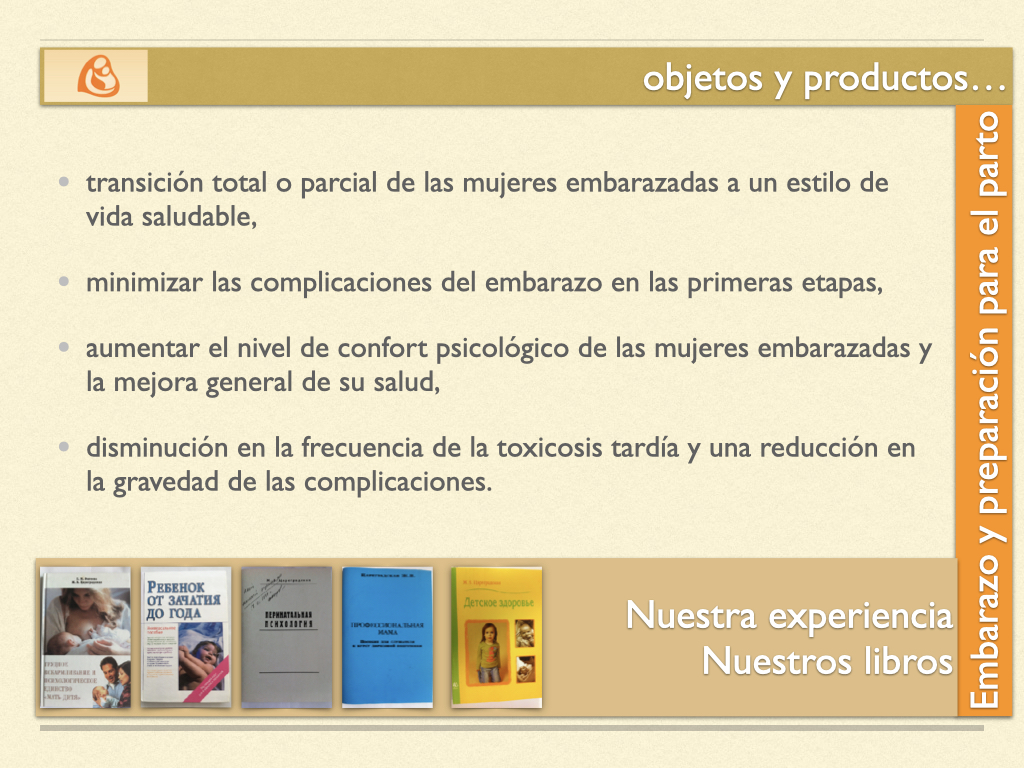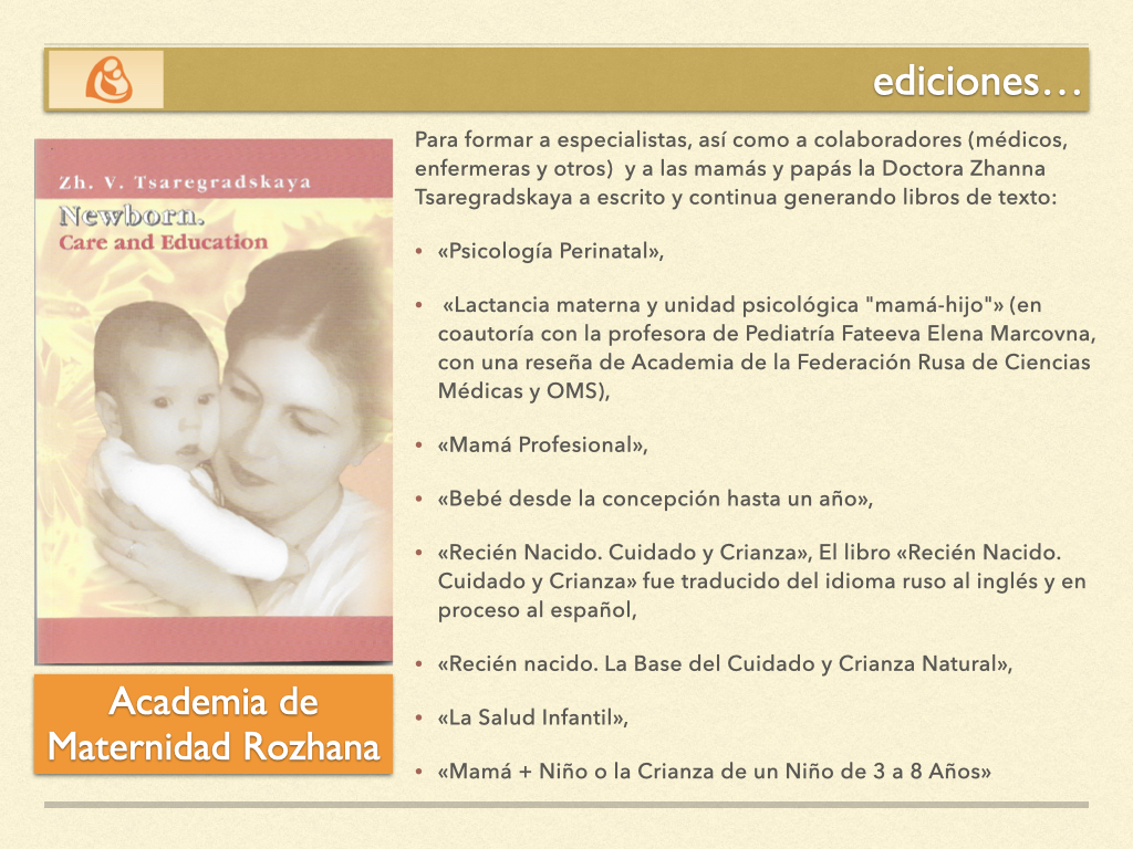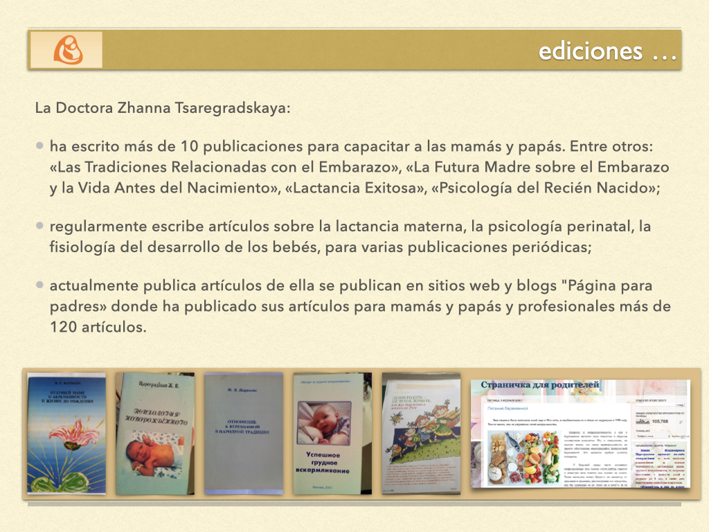 La Dra. Zhanna Tsaregradskaya ha escrito numerosos libros y artículos que respaldan este modelo, entre ellos: Psicología Perinatal , Lactancia materna y unidad psicológica «mamá-hijo» , Mamá Profesional , Bebé desde la concepción hasta un año , Recién Nacido. Cuidado y Crianza y Colección de artículos sobre la lactancia materna .